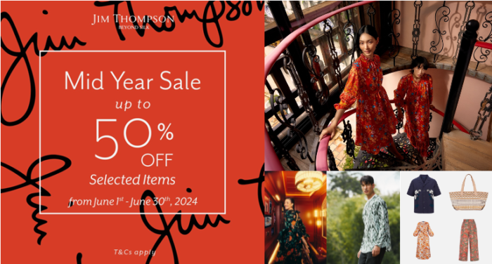 สายแฟชั่นพุ่งตัวด่วน! จิม ทอมป์สัน จัด MID-YEAR SALE ลดหนักมาก ขนไอเทมเด็ด ลดสูงสุด 50% ช้อปด่วนพร้อมกันทั่วประเทศทั้งที่สโตร์-ออนไลน์ ตลอดทั้งเดือนมิถุนายน พร้อมฟินกับส่วนลดสูงสุด 70% ณ ป๊อปอัปสโตร์ ที่ 3 ห้างดังทั่วกรุงเทพฯ