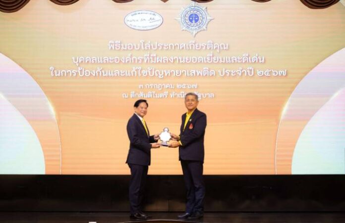 นายพีระพันธุ์ สาลีรัฐวิภาค รองนายกรัฐมนตรี และรัฐมนตรีว่าการกระทรวงพลังงาน เป็นประธานในพิธีมอบโล่ประกาศเกียรติคุณบุคคลและองค์กรที่มีผลงานยอดเยี่ยมและดีเด่นในการป้องกันและแก้ไขปัญหายาเสพติด ประจำปี 2567 เนื่องในวันต่อต้านยาเสพติดโลก แก่ นายณรงค์ อภิชัย ประธานสายปฏิบัติการพัฒนา มูลนิธิแม่ฟ้าหลวง ในพระบรมราชูปถัมภ์ ณ ตึกสันติไมตรี ทำเนียบรัฐบาล เมื่อวันก่อน จัดขึ้นโดยสำนักงาน ป.ป.ส. ร่วมกับ มูลนิธิ พล.ต.อ.เภา สารสิน ในฐานะบุคคลที่มีผลงานระดับดีเด่นด้านความร่วมมือระหว่างประเทศ จากผลงานที่นำองค์ความรู้การพัฒนาทางเลือกไปพัฒนาคุณภาพชีวิตในพื้นที่ปลูกพืชเสพติด พื้นที่หนองตะยา อำเภอพินเลา รัฐฉาน สาธารณรัฐแห่งสหภาพเมียนมา ตั้งแต่ปี 2564 จนถึงปัจจุบัน ถือเป็นแบบอย่างในการทำงานเพื่อสร้างสิ่งที่ดีให้กับสังคม