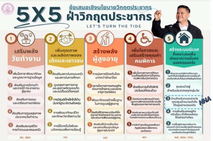 นายทวีพงษ์ วิชัยดิษฐ ผู้ว่าการการเคหะแห่งชาติ กล่าวว่า ในปี 2567 การเคหะแห่งชาติได้ขับเคลื่อนงานตามแนวนโยบายของ นายวราวุธ ศิลปอาชา รัฐมนตรีว่าการกระทรวงการพัฒนาสังคมและความมั่นคงของมนุษย์ ที่มีมุมมองต่อการพัฒนาศักยภาพทุนมนุษย์ และมุ่งเน้นนโยบายสำคัญ ที่เรียกว่า 5×5 ฝ่าวิกฤตประชากร ได้แก่ เสริมพลังวัยทำงาน เพิ่มคุณภาพและผลิตภาพของเด็กและเยาวชน สร้างพลังผู้สูงอายุ เพิ่มโอกาสและเสริมคุณค่าคนพิการ และสร้างระบบนิเวศที่เหมาะสมเพื่อพัฒนาความมั่นคงของครอบครัว (เกี่ยวข้องโดยตรงกับการเคหะแห่งชาติ) อันสืบเนื่องจากวิกฤตประชากร ซึ่งปัจจุบันมีอัตราการเกิดน้อยลง จึงต้องตอบโจทย์เพื่อให้คนต้องการแต่งงานและมีบุตร ดังนั้นการสร้างระบบนิเวศ (Eco-System) ที่เหมาะสมสำหรับครอบครัว โดยมีเป้าหมายทำให้ “คนไทยตั้งตัวได้” และ “ครอบครัวมีความมั่นคง” การเคหะแห่งชาติจึงเดินหน้าภารกิจ บ้านสำหรับคนทุกช่วงวัย (Housing for all) ซึ่งเป็นโครงการพัฒนาที่อยู่อาศัยและชุมชนยั่งยืน รองรับทุกกลุ่มเป้าหมายและทุกช่วงวัย