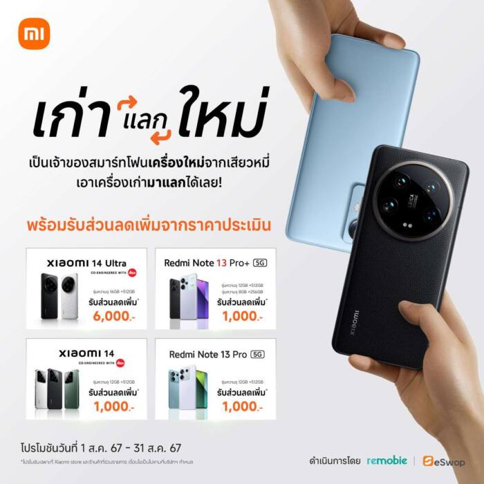 โดยลูกค้าที่สนใจสามารถสอบถามรายละเอียดเพิ่มเติมได้ที่ Xiaomi Store และร้านตัวแทนจำหน่ายที่ร่วมรายการ ในระหว่างวันที่ 1 ส.ค. 67 – 31 ส.ค. 67 เท่านั้น