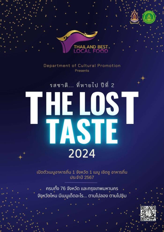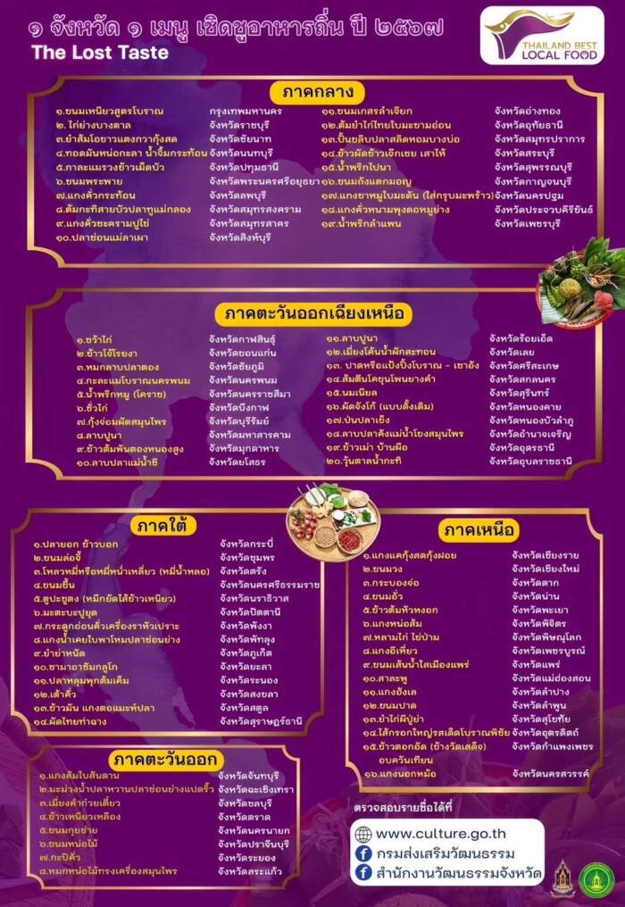 รมว.วธ กล่าวว่า บัดนี้ สวธ. ได้ผลการคัดเลือก 1 จังหวัด 1 เมนู เชิดชูอาหารถิ่น “รสชาติ…ที่หายไป The Lost Taste” ประจำปี 2567 แล้ว โดยมีเมนูอาหารที่ให้ประชาชนร่วมโหวตทั่วประเทศ 563 รายการ แบ่งเป็นเมนูอาหารคาว 234 รายการ เมนูอาหารหวาน 184 รายการ เมนูอาหารว่าง 143 รายการ และเมนูอาหารอื่น 2 รายการ ทั้งนี้ ประชาชนได้มีส่วนร่วมในการโหวตคัดเลือกผ่านสื่อท้องถิ่น สื่อออนไลน์ต่าง ๆ ทุกช่องทาง ซึ่งแต่ละเมนูมีความพิเศษและสะท้อนถึงวัฒนธรรมและวิถีชีวิตของแต่ละจังหวัดอย่างชัดเจน เช่น เมนูอาหารหวานจากจังหวัดปราจีนบุรี “ขนมหน่อไม้” ได้รับความสนใจและมีการโหวตสูงสุดถึง 22,945 คะแนน รองลงมาได้แก่ เมนูอาหารหวาน “ขนมถังแตกมอญ” จากจังหวัดกาญจนบุรี 4,660 คะแนน และ เมนูอาหารคาว “ปลายอก ข้าวบอก” จากจังหวัดกระบี่ 4,259 คะแนน นอกจากนี้ยังมีเมนูที่น่าสนใจอีกมากมาย อาทิ “ขนมเหนียวสูตรโบราณ” จากกทม. , “กาละแมรวงข้าวเม็ดบัว” จากจังหวัดปทุมธานี “ยำไก่ผีปู่ย่า” จากจังหวัดสุโขทัย, “แกงอีเหี่ยว”จากจังหวัดเพชรบูรณ์ และ “แกงคั่วหนามพุงดอหมูย่าง” จากจังหวัดประจวบคีรีขันธ์ ,“ข้าวมัน แกงตอแมะห์ปลา” จากจังหวัดสตูล “น้ำพริกหมู (โคราช)” จากจังหวัดนครราชสีมา, “นมเนียล” จากจังหวัดสุรินทร์ เป็นต้น
