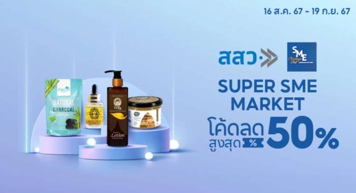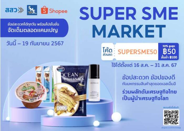สสว. ร่วมกับ ช้อปปี้ จัดแคมเปญออนไลน์ “SUPER SME MARKET” 16 สิงหาคม – 19 กันยายน 2567บนแพลตฟอร์มช้อปปี้ ชวนอุดหนุนสินค้าคัดสรรพิเศษจาก SME รับส่วนลดและโปรโมชันพิเศษตลอดแคมเปญ พร้อมเชิญชวนผู้ประกอบการสมัครเข้าร่วมรับสิทธิประโยชน์จากองค์กรพันธมิตรของ สสว.