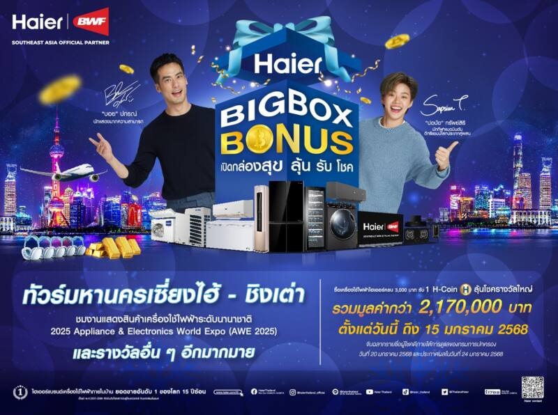 ไฮเออร์ (ประเทศไทย) ผู้นำด้านผลิตภัณฑ์และนวัตกรรมเครื่องใช้ไฟฟ้าระดับโลกและแบรนด์เครื่องใช้ไฟฟ้าอันดับ 1 ของโลกติดต่อกัน 15 ปีซ้อน จัดโปรโมชันสุดยิ่งใหญ่ประจำปี แจกกล่องสุขลุ้นรับโชค บินลัดฟ้าพาทัวร์มหานครเซี่ยงไฮ้-ชิงเต่า พร้อมชมงานแสดงสินค้าเครื่องใช้ไฟฟ้าระดับนานาชาติ AWE 2025 และรางวัลอื่น ๆ อีกมากมาย มูลค่ารวมกว่า 2 ล้านบาท เพียงซื้อเครื่องใช้ไฟฟ้าไฮเออร์ครบ 3,000 บาท รับสิทธิ์ลุ้นโชคทันที 1 สิทธิ์ (1 หมายเลข H-Coin) รางวัลที่ 1 แพ็คเกจทัวร์เซี่ยงไฮ้-ชิงเต่า มูลค่า 98,000 บาท จำนวน 10 รางวัล (รางวัลละ 2 ที่นั่ง) รางวัลที่ 2 ทองคำแท่งน้ำหนัก 1 บาท มูลค่า 40,800 บาท จำนวน 20 รางวัล รางวัลที่ 3 หูฟังแบบครอบ AirPods Max มูลค่า 17,270 บาท จำนวน 22 รางวัล