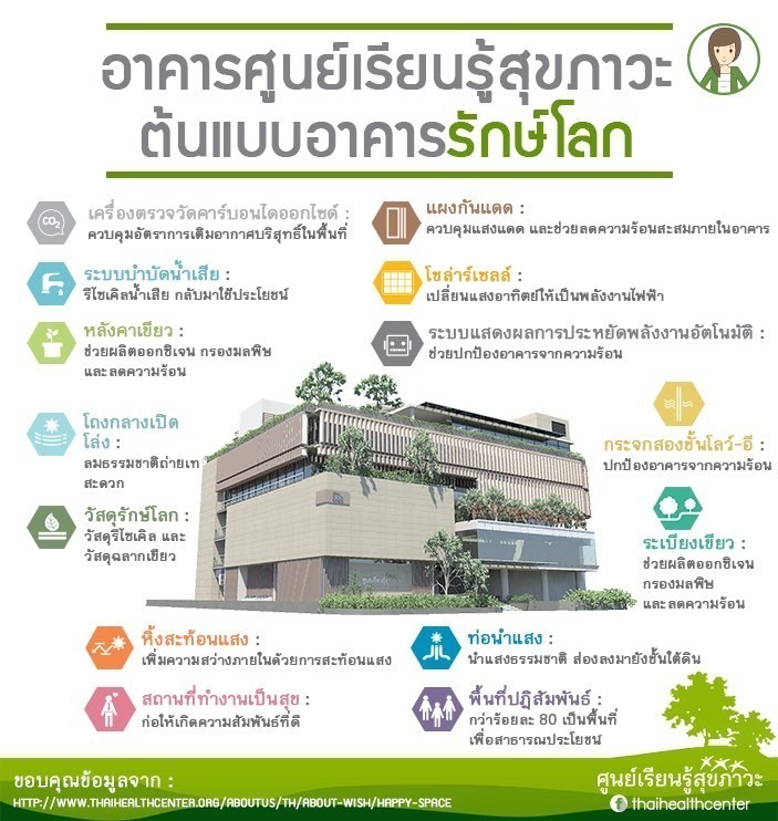 “สสส. เปิดพื้นที่อาคารศูนย์เรียนรู้สุขภาวะ ส่งต่อองค์ความรู้เพื่อให้ประชาชนทุกเพศทุกวัยสามารถนำองค์ความรู้ไปประยุกต์ใช้เพื่อสร้างชีวิตที่มีสุข ทั้งกาย จิต ปัญญา และสังคม ผ่านเส้นทางการเรียนรู้วิถีสีเขียว Green Building, Green Living สถาปัตยกรรมและวิถีสีเขียว 14 จุด ตอกย้ำการรับรองมาตรฐานอาคารที่สร้างสภาพแวดล้อมเพื่อสุขภาวะที่ดีของผู้ใช้งานอาคาร เป็นพื้นที่สาธารณะต้นแบบที่สนับสนุนและส่งเสริมกระบวนการเรียนรู้การสร้างสุขภาวะอย่างสร้างสรรค์ ติดต่อเข้าชมฟรี ทุกวันจันทร์-เสาร์ เวลา 08.30-17.00 น. โทร. 02 343 1500 หรืออีเมล์ exhibition.thc@thaihealth.or.th” นางสุรางครัตน์ กล่าว