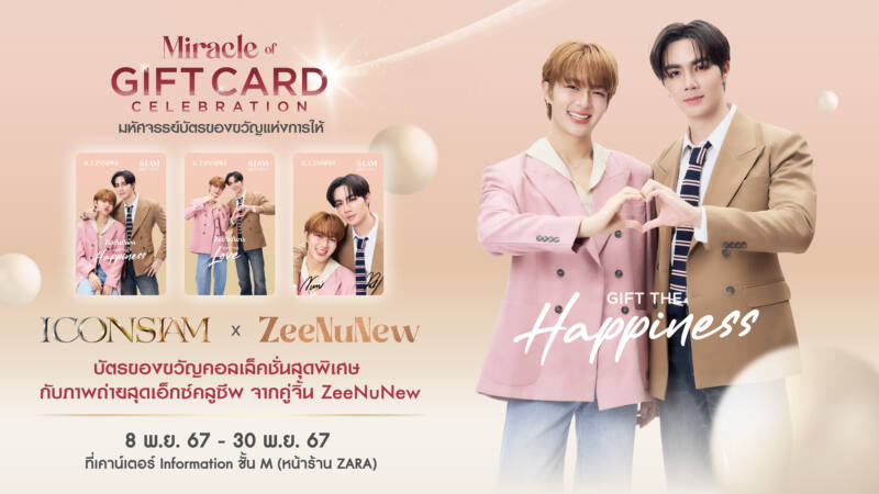 ไอคอนสยามเปิดตัวบัตรของขวัญ 2 คอลเลคชันพิเศษ ส่งท้ายปีเก่า ต้อนรับปีใหม่ ตอบสนองทุกความต้องการของคนทุกเจน ไม่ว่าจะเป็นแฟนด้อมคู่จิ้น หรือสายมูประกอบด้วย ICONSIAM x ZeeNuNew The Eternity Miracle of ZeeNuNew บัตรของขวัญคอลเลกชันสุดพิเศษด้วยภาพถ่ายสุดเอ็กซ์คลูซีฟที่ไม่เคยเปิดเผยที่ไหนมาก่อน จาก ZeeNuNew “ซี พฤกษ์ พานิช” และ “นุนิว ชวรินทร์ เพริศพิริยะวงศ์” ที่พร้อมส่งมอบความสุข ความน่ารักเกินพิกัด และความรักที่มีให้กันมายาวนาน ให้กับเหล่าแฟนคลับ “ซนซน นานานุ ซันไชน์” ได้เก็บสะสมเป็นของขวัญสุดพรีเมี่ยม พร้อมลุ้นรับสิทธิ์ Fast Fan เพื่อเข้าร่วมกิจกรรมสุดเอ็กซ์คลูซีฟก่อนใคร ในงาน “ZeeNuNew Miracle Day” วันที่ 20 ธันวาคม 2567 ณ เจริญนคร ฮอลล์ ชั้น M ไอคอนสยาม