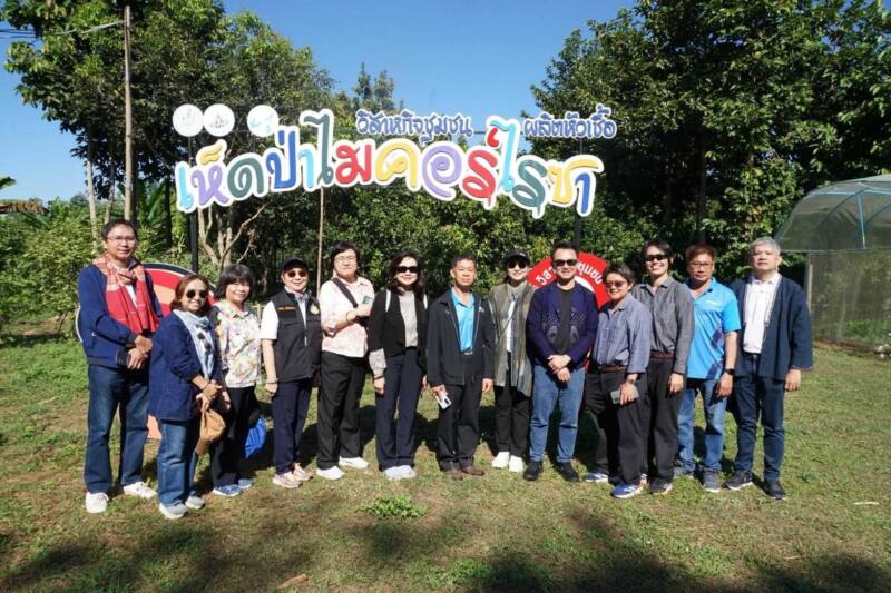 จากนั้นรับฟังการบรรยายสรุปผลการวิจัยและขยายองค์ความรู้ การปลูกไม้มีค่าและพืชเศรษฐกิจ ร่วมกับเห็ดไมคอร์ไรซาครบวงจร โดย ดร.สุจิตรา โกศล ประธานมูลนิธิเห็ดไมคอร์ไรซาเพื่ออนุรักษ์และฟื้นฟูป่าไม้ ผศ.ดร.วรรณา มังกิตะ รองประธานมูลนิธิฯ และ BEDO ทำงานร่วมกับสถาบันวิจัยวิทยาศาสตร์และเทคโนโลยีแห่งประเทศไทย (วว.) หรือมหาวิทยาลัยแม่โจ้-แพร่เฉลิมพระเกียรติ ตั้งแต่ปี 2562 เพื่อศึกษาต้นแบบการนำเทคโนโลยีการเพาะเห็ดไมคอร์ไรซาแบบจำลองธรรมชาติมาส่งเสริมให้ชุมชนปลุกและดูแลต้นไม้ที่จูงใจด้วยการใส่เชื้อเห็ดป่าไมคอร์ไรซาที่ช่วยให้ต้นไม้เจริญเติบโตและมีผลผลิตเป็นเห็ดช่วยสร้างรายได้สู่ครอบครัวและชุมชน อันเป็นการพัฒนาเศรษฐกิจชุมชนอย่างยั่งยืน