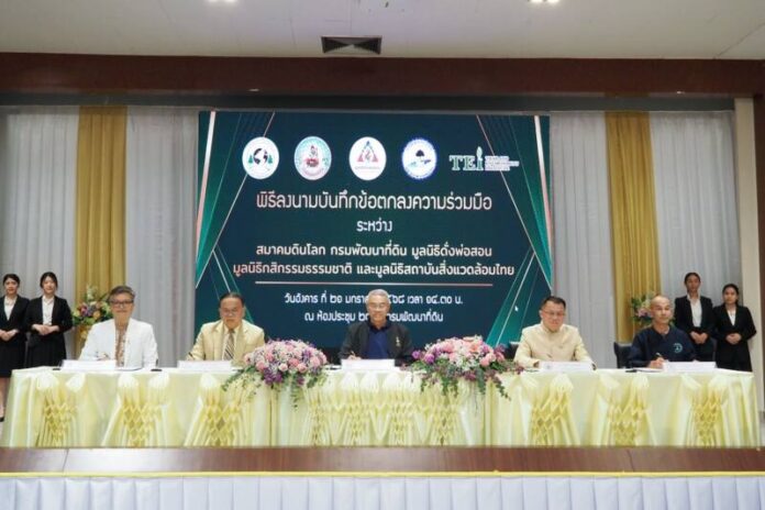 ณ กรมพัฒนาที่ดิน กรุงเทพมหานคร- สถาบันสิ่งแวดล้อมไทย หรือ TEI เดินหน้าขับเคลื่อนงานด้านสิ่งแวดล้อม ผสานกำลังสมาคมดินโลก กรมพัฒนาที่ดิน มูลนิธิดั่งพ่อสอน และมูลนิธิกสิกรรมธรรมชาติ ลงนามบันทึกข้อตกลงความร่วมมือเพื่อเผยแพร่องค์ความรู้เกี่ยวกับการจัดการทรัพยากรดินอย่างยั่งยืน หลังพบปัจจุบันดินประสบกับสภาวะความเสื่อมโทรมจากปัจจัยต่าง ๆ พร้อมมุ่งหวังการผสานกำลังครั้งนี้คือจุดเริ่มต้นที่สำคัญในการผลักดันให้เกิดการพัฒนาที่มุ่งเน้นการอนุรักษ์และใช้ประโยชน์ทรัพยากรดินอย่างชาญฉลาด รักษาคุณภาพดินเพื่อให้เป็นแหล่งผลิตอาหารที่ยั่งยืนต่อไป