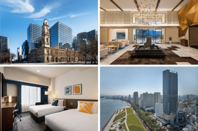 ตามเข็มนาฬิกาจากมุมซ้ายบน: Adelaide Marriott Hotel โรงแรมแห่งที่ 600 ใน APEC; Katra Marriott Resort & Spa โรงแรมแห่งที่ 150 ในอินเดีย; Penang Marriott Complex โรงแรมแห่งที่ 50 ในมาเลเซีย; Four Points Flex by Sheraton Osaka Umeda โรงแรมแห่งที่ 100 ในญี่ปุ่น