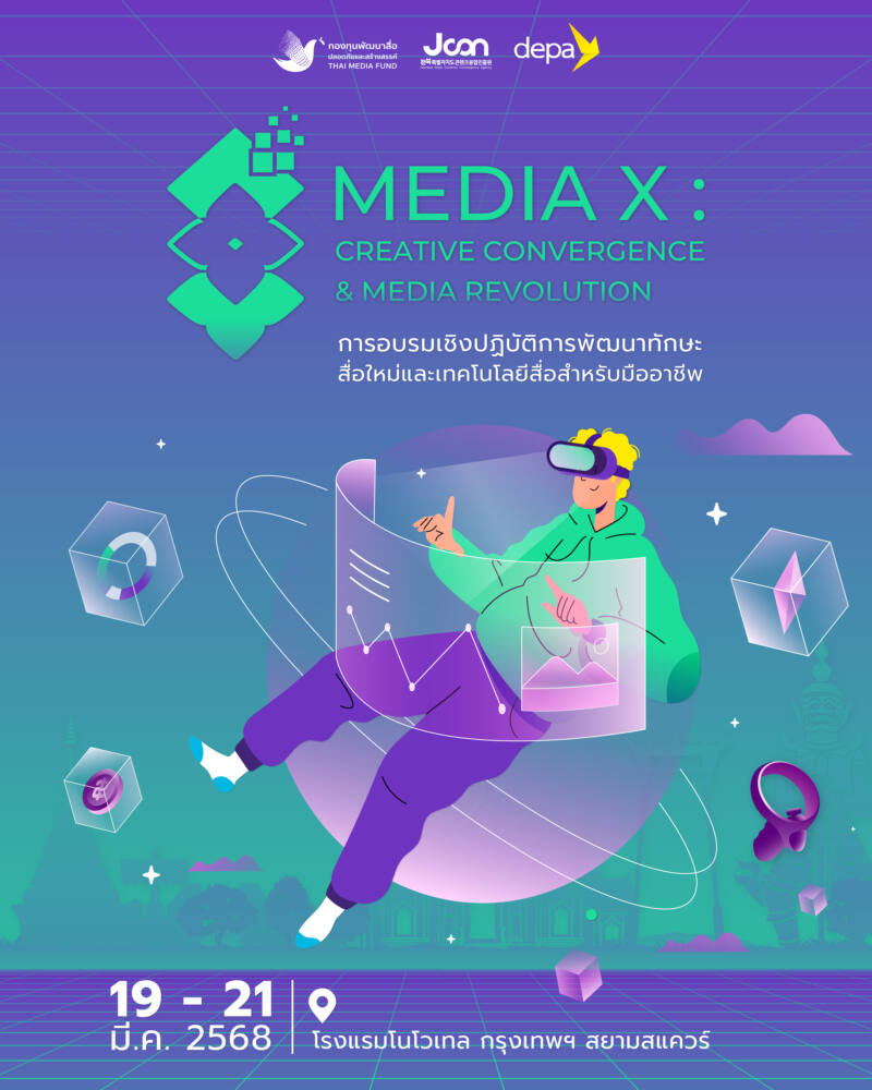 การเปลี่ยนแปลงที่รวดเร็วของอุตสาหกรรมสื่อทำให้บุคลากรต้องเร่งปรับตัว การจัดอบรม “Media X: Creative Convergence and Media Revolution” เพื่อสร้างทักษะและส่งเสริมองค์ความรู้ให้ผู้ผลิตสื่อไทยสามารถประยุกต์ใช้เทคโนโลยี AI, VR, AR และ Immersive Media มาสร้างสรรค์คอนเทนต์คุณภาพสูง พร้อมยกระดับ Soft Power ของประเทศให้สามารถแข่งขันได้ในเวทีโลก”