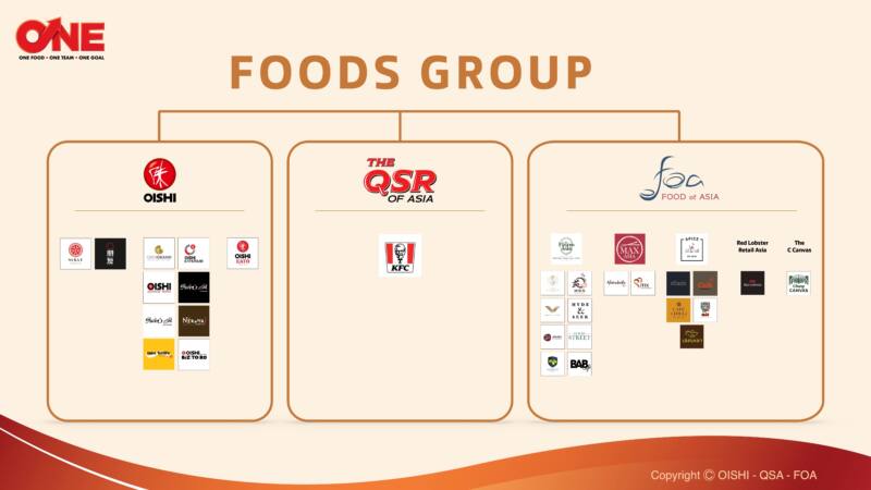 ภายใต้กลุ่มธุรกิจอาหารในเครือไทยเบฟ ประกอบด้วยความหลากหลายของธุรกิจบริการอาหารที่มีศักยภาพ สามารถตอบสนองความต้องการของผู้บริโภคได้อย่างครอบคลุมและมีประสิทธิภาพ โดยรวมพลังระหว่าง 3 บริษัท ได้แก่ บริษัท โออิชิ โฮลดิ้ง จำกัด หรือ OISHI (โออิชิ), บริษัท เดอะ คิวเอสอาร์ ออฟ เอเชีย จำกัด หรือ QSA (คิวเอสเอ), และ บริษัท ฟู้ด ออฟ เอเชีย จำกัด หรือ FOA (เอฟโอเอ) ภายใต้วิสัยทัศน์ ONE FOODS GROUP: ONE FOOD – ONE TEAM – ONE GOAL และเป้าหมายในการดำเนินงานร่วมกัน