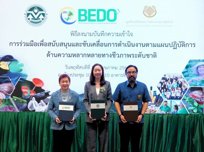 ดร.ชญานันท์ ภักดีจิตต์ เลขาธิการสำนักงานนโยบายและแผนทรัพยากรธรรมชาติและสิ่งแวดล้อม (สผ.) นางสุวรรณา เตียรถ์สุวรรณ ผู้อำนวยการสำนักงานพัฒนาเศรษฐกิจจากฐานชีวภาพ (สพภ.) และหม่อมหลวงดิศปนัดดา ดิศกุล เลขาธิการและประธานเจ้าหน้าที่บริหารมูลนิธิแม่ฟ้าหลวง ในพระบรมราชูปถัมภ์ (มูลนิธิแม่ฟ้าหลวงฯ) ลงนามในบันทึกความเข้าใจ (MOU) ความร่วมมือเพื่อสนับสนุนและขับเคลื่อนการดำเนินงานตามแผนปฏิบัติการด้านความหลากหลายทางชีวภาพระดับชาติ ณ สำนักงานนโยบายและแผนทรัพยากรธรรมชาติและสิ่งแวดล้อม
