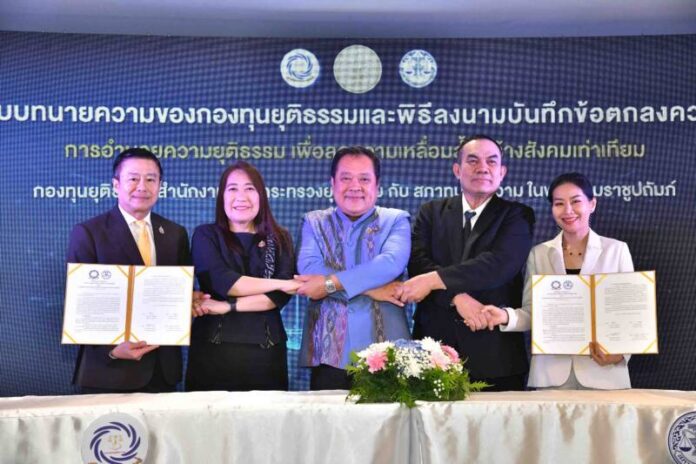 และเพื่อให้การทำงานช่วยเหลือประชาชนให้สามารถเข้าถึงกระบวนการยุติธรรมได้อย่างทั่วถึงและมีมาตรฐานเดียวกัน จึงจำเป็นอย่างยิ่งที่จะต้องมีการพัฒนาระบบงาน ระเบียบหรือหลักเกณฑ์แนวทางต่างๆ ให้ทันสมัย พร้อมทั้งพัฒนาระบบทนายความของกองทุนยุติธรรม ให้สามารถขับเคลื่อนได้อย่างเป็นรูปธรรมและมีประสิทธิภาพมากยิ่งขึ้น สภาทนายความ ในพระบรมราชูปถัมภ์ และ กองทุนยุติธรรม สำนักงานปลัดกระทรวงยุติธรรม จึงได้ร่วมลงนามบันทึกข้อตกลงความร่วมมือ (MOU) เรื่อง “การอำนวยความยุติธรรม เพื่อลดความเหลื่อมล้ำ สร้างสังคมเท่าเทียม”