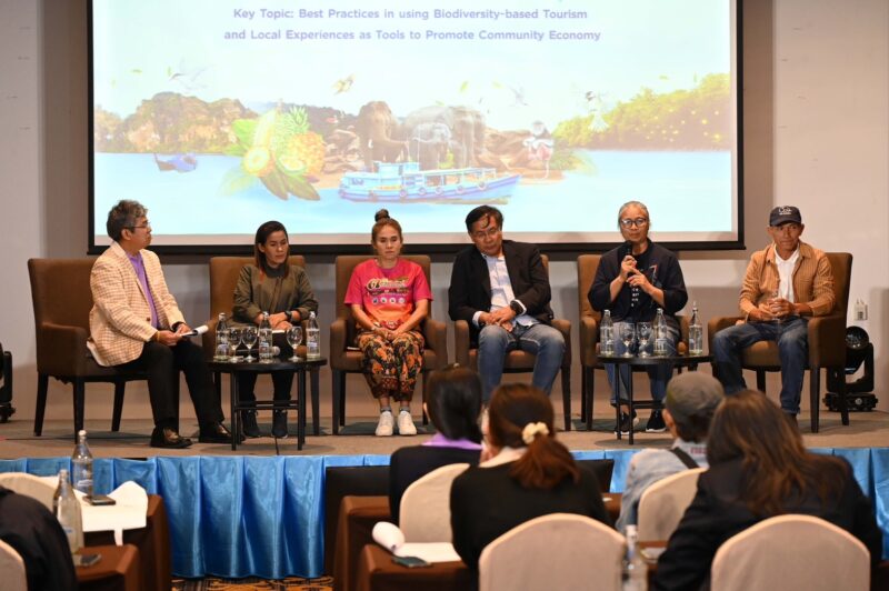 ในช่วงเช้ายังมีเวทีเสวนา หัวข้อ “ทิศทาง มาตรฐาน และการส่งเสริมการท่องเที่ยวบนฐานความหลากหลายทางชีวภาพ” โดย นายอธึก ประเสนมูล ผู้อำนวยการกองพัฒนาแหล่งท่องเที่ยวกรมการท่องเที่ยว นายศิริปกรณ์ เชี่ยวสมุทร ผู้อำนวยการ อพท. นายปรีดา สุขใจ รองผู้ว่าราชการจังหวัดประจวบคีรีขันธ์ Mr. Martin Venzky-Stalling Sustainable Development Committee Chair, Joint Foreign Chambers of Commerce in Thailand (JFCCT) and GSTC/ PATA member และ Mr. Robert Steele Founder/Director of Systainability Asia และเวทีเสวนาหัวข้อ “การสร้างการรับรู้ มาตรการจูงใจ และการขยายผลจากการท่องเที่ยวบนฐานความหลากหลายทางชีวภาพ” นายสุเทพ พิมพ์ศิริ บ้านถ้ำเสือโฮมสเตย์ จ.เพชรบุรี นางสาววรรณวิภา ภานุมาต จาก Local Alike, Ms. Carol Liew, Managing Director, ECCA Family Foundation และ Dr. Scott Smith, Responsible Tourism Development Academy