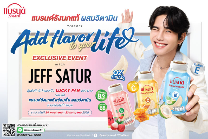 “แบรนด์รังนกแท้พร้อมดื่มผสมวิตามิน” โดยบริษัท ซันโทรี่ เบเวอเรจ แอนด์ ฟู้ด (ประเทศไทย) จำกัด ชวนแฟน ๆ ลุ้นเป็นหนึ่งใน 200 ผู้โชคดีที่จะได้ใกล้ชิดและร่วมกิจกรรมสุดเอ็กซ์คลูซีฟกับ “เจฟ ซาเตอร์” ในกิจกรรม “แบรนด์รังนกแท้พร้อมดื่มผสมวิตามิน present Add flavor to your life with JEFF SATUR” โดยร่วมกิจกรรมได้ตั้งแต่วันที่ 24 พฤษภาคม – 23 กรกฎาคม 2568 กติการ่วมสนุกง่ายๆ ดังนี้