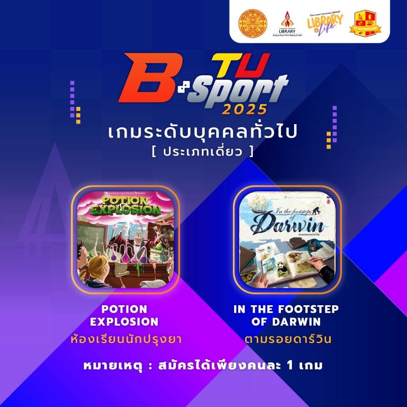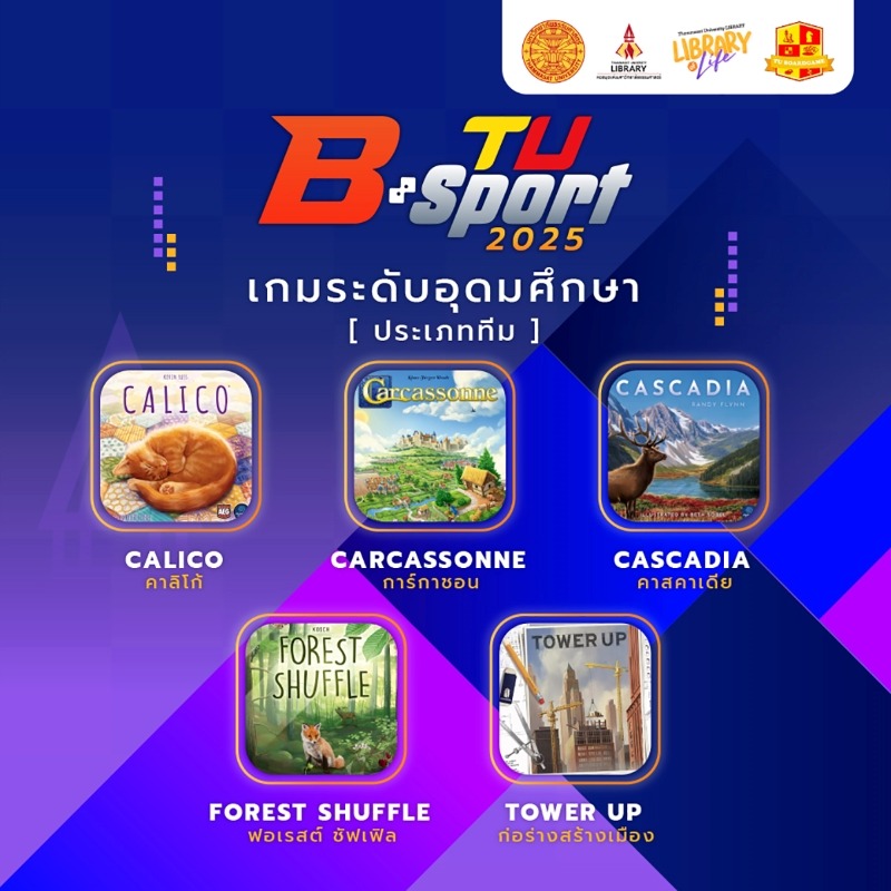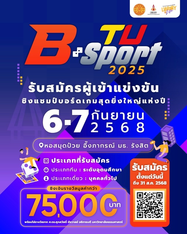 การจัดการแข่งขัน TU B-Sport 2025 นั้น กำหนดจัดขึ้นระหว่างวันที่ 6-7 กันยายน 2568 ณ หอสมุดป๋วย อึ๊งภากรณ์ มหาวิทยาลัยธรรมศาสตร์ ศูนย์รังสิต ประเภทการแข่งขันจะเป็นออกเป็น 2 ประเภท คือ ประเภททีม ระดับอุดมศึกษา ทีมละ 5 คน รับสมัครไม่เกิน 2 ทีมต่อ 1 สถาบัน เกมที่ใช้ในการแข่งขันได้แก่ Calico คาลิโก้ Carcassonne การ์กาชอน Cascadia คาสคาเดีย Forest Shuffle ฟอเรสต์ ชัฟเฟิล และ Tower Up ก่อร่างสร้างเมือง ประเภทที่ 2 คือ ประเภทเดี่ยว โดยเปิดโอกาสให้นักเรียนและบุคคลทั่วไปได้เข้าร่วมแข่งขัน เกมที่ใช้การแข่งขันประเภทนี้ ได้แก่ Potion Explosion ห้องเรียนนักปรุงยา และ In the Footstep of Darwin ผู้ที่สนใจสามารถสมัครได้ตั้งแต่วันนี้ถึง 31 สิงหาคม 2568 ได้ที่ https://forms.gle/bKYYM6icMQ5D9ciL9 หรือหากต้องการรายละเอียดเพิ่มเติมสามารถติดตามได้ที่เพจ Thammasat University Library และเว็บไซต์ของหอสมุดแห่งมหาวิทยาลัยธรรมศาสตร์ www.library.tu.ac.th