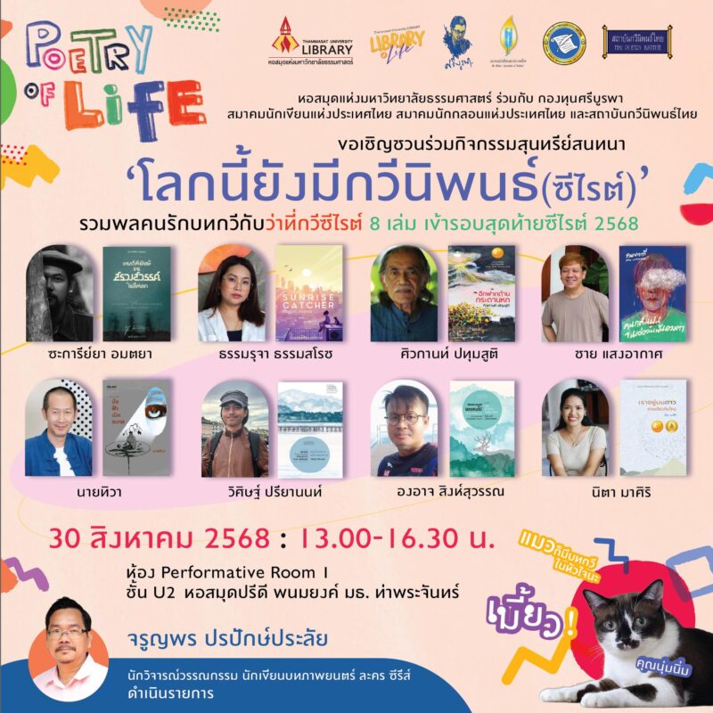 หอสมุด มธ. ผนึกเครือข่าย จัดกิจกรรม Poetry of Life สุนทรีย์สนทนา “โลกนี้ยังมีกวีนิพนธ์ (ซีไรต์)” กับ “ว่าที่กวีซีไรต์” 2568 ที่ มธ. ท่าพระจันทร์ 30 ส.ค. 68 นี้