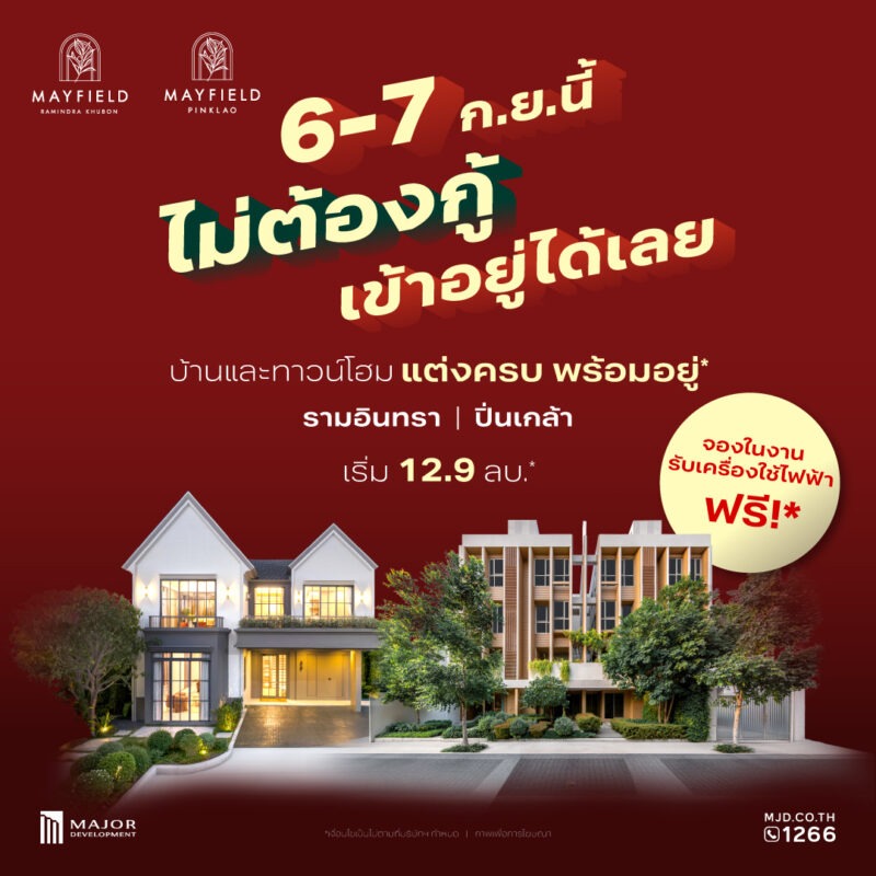ผู้สนใจสามารถร่วมอีเว้นท์พิเศษ พร้อมสอบถามรายละเอียดการเข้าร่วมแคมเปญ “Mayfield PayLater” ณ โครงการ Mayfield Pinklao (เมย์ฟิลด์ ปิ่นเกล้า) และ Mayfield Ramintra-Khubon (เมย์ฟิลด์ รามอินทรา-คู้บอน) 6–7 กันยายน 2568 ภายในงานยังมีสิทธิพิเศษสำหรับผู้ที่จองบ้านในวันงาน รับ เครื่องใช้ไฟฟ้าทันที และยังได้สัมผัสประสบการณ์จริงของบ้านตัวอย่าง รวมถึงการพูดคุยกับทีมฝ่ายขายและที่ปรึกษาทางการเงินอย่างใกล้ชิด ลงทะเบียนได้ที่ https://www.mjd.co.th/ หรือสอบถามเพิ่มเติมที่ MJD Contact Center 1266 Line Official > @mjd.th (https://bit.ly/MJDLine)