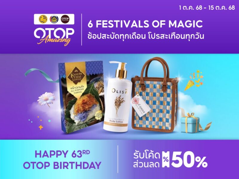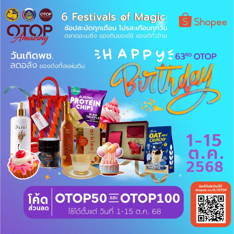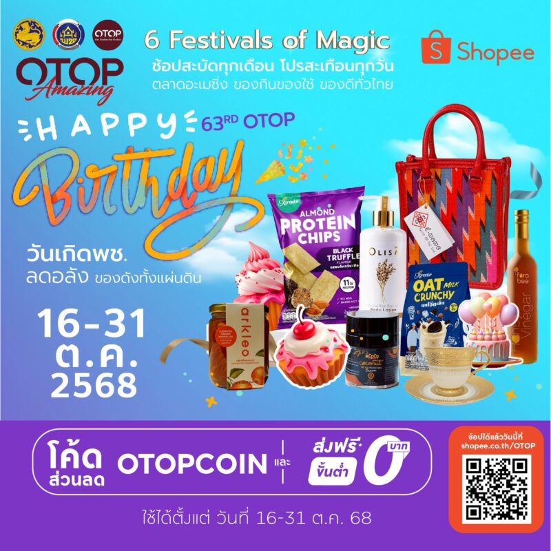 “OTOP Amazing: 6 Festivals of Magic ช้อปสะบัดทุกเดือน โปรสะเทือนทุกวัน ไม่เพียงเปิดโอกาสให้ประชาชนได้เลือกซื้อสินค้า OTOP คุณภาพดีในราคาสุดพิเศษ แต่ยังเป็นเวทีสำคัญในการสร้างรายได้และเพิ่มศักยภาพการตลาดให้แก่ผู้ประกอบการท้องถิ่นทั่วประเทศ ในเดือนตุลาคมนี้ แคมเปญส่งเสริมการขาย “Happy 63rd OTOP Birthday วันเกิด พช. ลดอลัง ของดังทั้งแผ่นดิน” ระหว่าง 1-31 ตุลาคม 2568 ซึ่งเป็นแคมเปญย่อยที่ 4 ของโครงการ คัดสรรครบทั้งของกิน ของใช้ ของฝากสุดพรีเมียม มาจำหน่ายออนไลน์บนช้อปปี้ จึงขอเชิญชวนพี่น้องประชาชนร่วมอุดหนุนสินค้า OTOP ผ่านแคมเปญพิเศษสุดยิ่งใหญ่นี้ พร้อมกันทั่วประเทศ ส่วนผู้ประกอบการที่สนใจเข้าร่วมโครงการ ก็สามารถสมัครได้ที่สำนักงานพัฒนาชุมชนอำเภอและจังหวัดทุกแห่งตลอดโครงการ” อธิบดี พช. กล่าวเชิญชวน