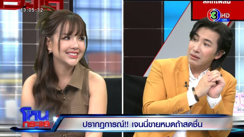 รายการ โหนกระแส วันที่ 13 ต.ค. ดำเนินรายการโดย “หนุ่ม กรรชัย กำเนิดพลอย” ผลิตในนามบริษัท ดีคืนดีวัน จำกัด ออกอากาศทุกวันจันทร์-ศุกร์ เวลา 12.35 น. ทางช่อง 3 กดหมาย เลข 33 สัมภาษณ์ “เจนนี่ ได้หมดถ้าสดชื่น” ผู้สร้างปรากฏการณ์ขายในรูปแบบใหม่ แค่ 2 วัน ฟันไปแล้ว 100 ล้าน พร้อมเคลียร์สารพัดดราม่า