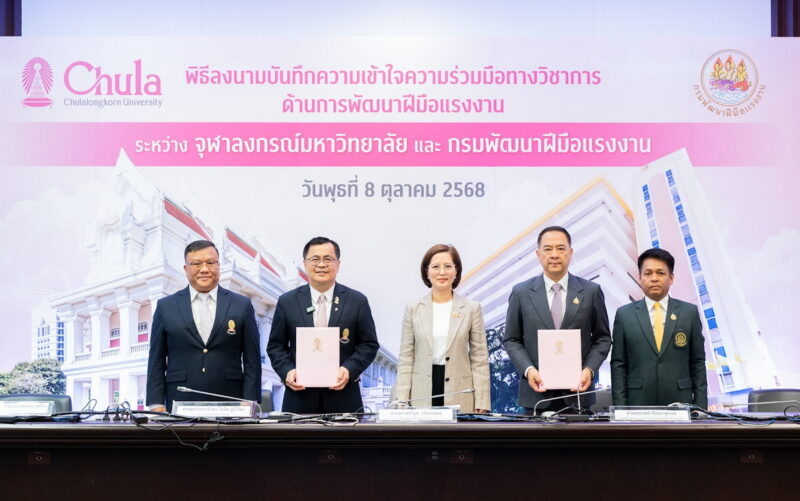 จุฬาลงกรณ์มหาวิทยาลัย ร่วมกับ กระทรวงแรงงาน โดยกรมพัฒนาฝีมือแรงงาน ลงนามบันทึกความเข้าใจความร่วมมือทางวิชาการด้านการพัฒนาฝีมือแรงงาน เพื่อยกระดับศักยภาพกำลังคนของประเทศให้สอดคล้องกับความต้องการของตลาดแรงงานในยุคเทคโนโลยีเปลี่ยนผ่าน โดยมี นางสาวตรีนุช เทียนทอง รัฐมนตรีว่าการกระทรวงแรงงาน เป็นประธานในพิธีลงนามและกล่าวแสดงความยินดี จากนั้น ศ.ดร.วิเลิศ ภูริวัชร อธิการบดีจุฬาลงกรณ์มหาวิทยาลัย และ นายสมาสภ์ ปัทมะสุคนธ์ รองปลัดกระทรวงแรงงาน รักษาราชการแทนปลัดกระทรวงแรงงาน ลงนามในบันทึกความเข้าใจความร่วมมือทางวิชาการด้านการพัฒนาฝีมือแรงงาน โดยได้รับเกียรติจาก รศ.ดร.ศิริเดช สุชีวะ รองอธิการบดีจุฬาฯ และ นายภัทรวุธ เภอแสละ รองอธิบดีกรมพัฒนาฝีมือแรงงาน ร่วมลงนามเป็นสักขีพยาน
