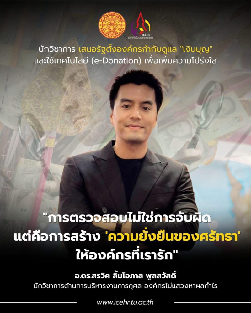 สถาบันเสริมศึกษาและทรัพยากรมนุษย์ มหาวิทยาลัยธรรมศาสตร์ เปิดเผยบทสัมภาษณ์ของ ดร.สรวิศ ลิ้มโอภาส พูลสวัสดิ์ นักวิชาการด้านการบริหารงานการกุศล องค์กรไม่แสวงหาผลกำไร เสนอรัฐตั้งองค์กรกำกับดูแล “เงินบุญ” และใช้เทคโนโลยี (e-Donation) เพื่อเพิ่มความโปร่งใส