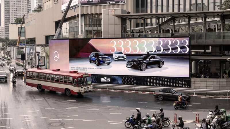 ในช่วงสัปดาห์ที่ผ่านมา คนไทยหลายคนอาจเห็นตัวเลข “333” ที่ปรากฏอยู่บนโซเชียลมีเดีย และสื่อนอกบ้านแบบ Digital Out of Home (DOOH) ที่กระจายอยู่ตามพื้นที่ใจกลางกรุงเทพมหานคร ซึ่งมาในรูปแบบของโฆษณาที่เนื้อหาทั้งหมดขึ้นเป็นเลข 3333333333 ไม่ว่าจะเป็นในส่วนของหัวข้อและรายละเอียดต่างๆ จนอาจเกิดข้อสงสัยมากมายว่าเลข 3 ที่ว่านี้ สื่อถึงอะไร แต่ชิ้นงานโฆษณาดังกล่าวก็ยังมีจุดสังเกตที่พอให้ผู้คนเดาออกว่าสิ่งนี้ต้องเกี่ยวข้องกับแบรนด์เมอร์เซเดส-เบนซ์ คือภาพของรถยนต์เมอร์เซเดส-เบนซ์ จำนวน 3 รุ่น