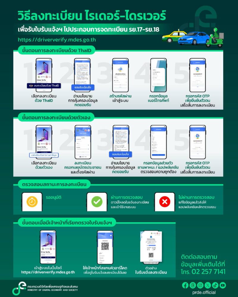 – เปิดให้ลงทะเบียนผ่านเว็บไซต์ https://driververify.mdes.go.th (ล็อกอินผ่าน Thai ID) ไปจนถึงวันที่ 28 กุมภาพันธ์ 2569 ซึ่งเมื่อข้อมูลได้รับการยืนยันจากแพลตฟอร์ม จะได้รับ “ใบรับแจ้งลงทะเบียน” (QR Code) เพื่อใช้แสดงต่อเจ้าหน้าที่ตำรวจได้ทันที และผู้ขับขี่จะต้องดำเนินการจดทะเบียนเป็นรถสาธารณะและทำใบขับขี่สาธารณะกับกรมการขนส่งทางบกให้แล้วเสร็จภายในวันที่ 28 กุมภาพันธ์ 2569