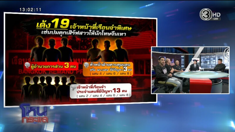 โหนกระแส วันที่ 24 พ.ย. ดำเนินรายการโดย “หนุ่ม กรรชัย กำเนิดพลอย” ผลิตในนามบริษัท ดีคืนดีวัน จำกัด ออกอากาศทุกวันจันทร์-ศุกร์ เวลา 12.35 น. ทางช่อง 3 กดหมาย เลข 33 สัมภาษณ์ ผู้พันตึ๋ง เฉลิมชัย มัจฉากล่ำ , เบนซ์-บอม อดีตผู้ต้องขังเรือนจำคลองเปรม , พล.ต.ต.วิชัย สังข์ประไพ อดีตรองผู้บัญชาการตำรวจนครบาล