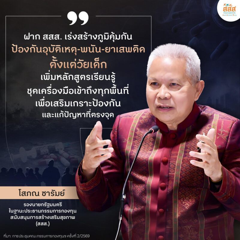 นายโสภณ ซารัมย์ รองนายกรัฐมนตรี ในฐานะประธานกรรมการกองทุนสนับสนุนการสร้างเสริมสุขภาพ (สสส.) เป็นประธานการประชุมคณะกรรมการกองทุนฯ ครั้งที่ 2/2569 เมื่อวันที่ 16 กุมภาพันธ์ 256 กล่าวว่า ที่ประชุมรับทราบผลการดำเนินงานการจัดการความปลอดภัยและปัจจัยเสี่ยงทางสังคม ซึ่งเป็นการทำงาน สสส. ร่วมกับภาคีเครือข่ายทั้งภาครัฐ เอกชน และประชาสังคม พบว่า ในภาพรวมผู้เสียชีวิตจากอุบัติเหตุทางถนนลดลงจาก 17,477 คน ในปี 2567 เหลือ 15,534 คน ในปี 2568 หรือคิดเป็น 11% โดยกลุ่มเสี่ยงหลักยังเป็นเด็กและเยาวชน อายุ 15-24 ปี เสียชีวิตจากรถจักรยานยนต์สูงสุด 81.1% ไม่สวมหมวกนิรภัย 79.3% ส่วนใหญ่เกิดเหตุในพื้นที่ใกล้บ้าน ระยะทางไม่เกิน 5 กิโลเมตร สอดคล้องกับสถิติในช่วงเทศกาลปีใหม่ (วันที่ 30 ธ.ค. 2568 – 5 ม.ค. 2569) อุบัติเหตุรวม 1,511 ครั้ง บาดเจ็บ 1,464 คน และเสียชีวิต 272 คน ซึ่งลดลง 10.2% ดังนั้น สสส. จึงนำข้อมูลมาถอดบทเรียนใช้ข้อมูลเป็นฐาน เพื่อยกระดับความปลอดภัยทางถนนครอบคลุมทั้งในระดับจังหวัด อำเภอ ชุมชน นอกจากนี้ยังเฝ้าระวังเรื่องการพนันในสังคมไทยซึ่งเป็นอีกปัจจัยเสี่ยง หลังพบ ปี 2566 คนไทย 34.5 ล้านคน เล่นการพนัน เป็นเด็กและเยาวชน 4.9 ล้านคน ส่งผลให้เกิดปัญหนี้สิน ความเครียด เสียสุขภาพจิต และทะเลาะกับคนในครอบครัว นำไปสู่ปัญหาคุณภาพชีวิต