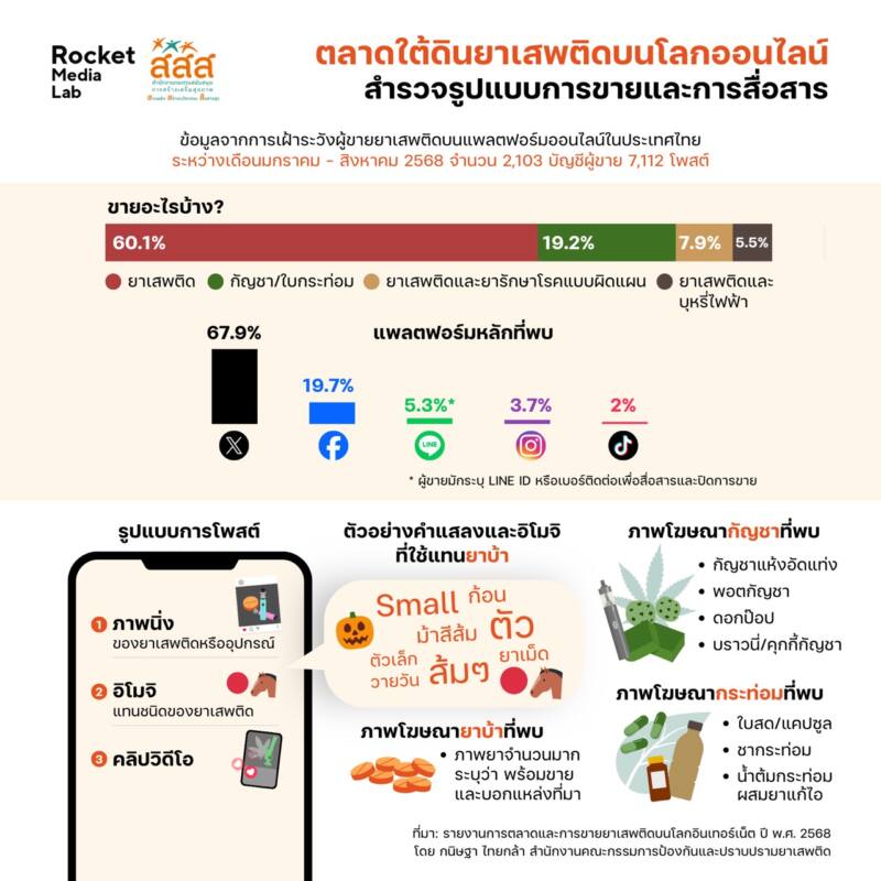 นายสันติชัย อาภรณ์ศรี บรรณาธิการบริหาร Rocket Media Lab กล่าวว่า จากการรวบรวมและวิเคราะห์ข้อมูลสถานการณ์ที่เกิดขึ้น พบพฤติกรรมและปัจจัยการเข้าถึงยาเสพติดของเยาวชนใน 3 มิติ ได้แก่ 1.การเปลี่ยนแปลงพฤติกรรมการใช้ยาเสพติดหลังการปลดล็อกพืชเสพติด ที่ยาบ้ายังเป็นสารหลักที่มีผู้ใช้สูงสุด แต่เยาวชนที่ใช้กัญชาและกระท่อมก็เพิ่มสูงขึ้นอย่างก้าวกระโดด โดยปี 2567 พบเยาวชนใช้กัญชาเพิ่มขึ้น 3,240 คน และใช้น้ำต้มใบกระท่อม 1,579 คน อีกทั้งยังผสมสารเคมีอันตรายตามความเชื่อผิดๆ เพื่อเพิ่มฤทธิ์มึนเมา 2.นวัตกรรมการซื้อขายและสถานที่มั่วสุม ตลาดออนไลน์กลายเป็นช่องทางหลัก โดยเฉพาะบนแพลตฟอร์ม X ที่พบการประกาศขายมากที่สุด 68% มีการใช้สัญลักษณ์อิโมจิแทนชื่อยาเพื่อหลบเลี่ยงระบบตรวจสอบ ขณะที่พฤติกรรมการมั่วสุมเปลี่ยนจากพื้นที่สาธารณะเป็นพื้นที่ส่วนตัว เช่น ห้องพัก พูลวิลล่าหรือรีสอร์ต เพื่อเลี่ยงการจับกุม 3.วิกฤตขีดความสามารถด้านการบำบัด ที่พบว่ายอดผู้เข้าบำบัดปี 2568 คาดว่าจะสูงถึง 260,000 คน ซึ่งเกินศักยภาพที่ระบบสาธารณสุขจะรองรับได้ ยิ่งไปกว่านั้นไทยยังขาดแคลนบุคลากรจิตแพทย์เฉพาะทางด้านการเสพติด นี่จึงเป็นโจทย์สำคัญที่ทุกภาคส่วนต้องร่วมกันแก้ปัญหาเพื่อคืนเยาวชนให้กลับสู่สังคมอย่างมีคุณภาพ