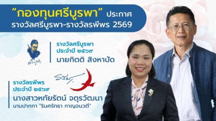 นางชมัยภร บางคมบาง ศิลปินแห่งชาติ สาขาวรรณศิลป์ และประธานกองทุนศรีบูรพา ประกาศผล “รางวัลศรีบูรพา” ประจำปี 2569 ได้แก่ นายกิตติ สิงหาปัด ซึ่งนับว่าได้รับรางวัลเป็นคนที่ 36 ขณะที่ “รางวัลรพีพร” ประจำปี 2569 ได้แก่ นางสาวหทัยรัตน์ จตุรวัฒนา นามปากกา “รินศรัทธา กาญจนวตี”