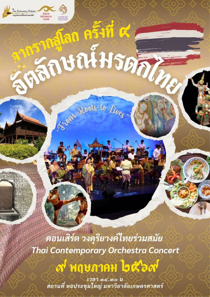 งานคอนเสิร์ตวงดุริยางค์ไทยร่วมสมัย จากรากสู่โลก ครั้งที่ 4 “บทเพลงอัตลักษณ์มรดกไทย” จัดขึ้นวันเสาร์ที่ 9 พฤษภาคม 2569 เวลา 14.30–16.00 น. ณ หอประชุมใหญ่ มหาวิทยาลัยเกษตรศาสตร์ (บางเขน)