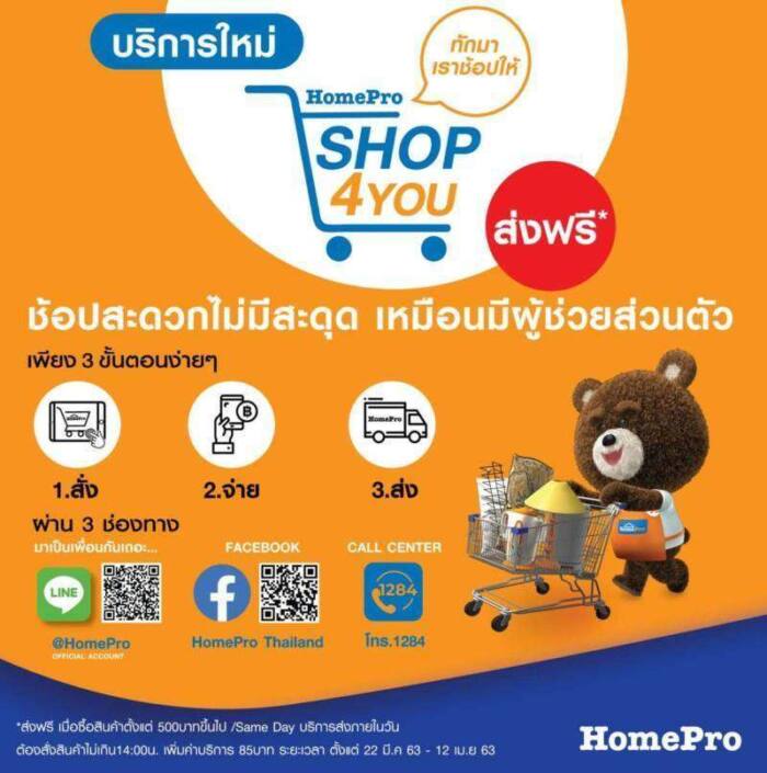 โฮมโปร เล็งเห็นความสำคัญในการป้องกันไวรัสโควิด-19 จึงได้เปิดบริการใหม่ SHOP4YOU เพียงเพิ่มเพื่อนใน Line @Homepro หรือ โทร 1284 “ทักมาเราช้อปให้” แค่นี้ง่ายๆ เหมือนมีผู้ช่วยส่วนตัว ในการช้อปสินค้าเรื่องบ้านผ่านช่องทางออนไลน์ของโฮมโปร ทั้งยังช่วยเอื้ออำนวยความสะดวกให้กับลูกค้าตลอด 24 ชั่วโมง เริ่ม 24 มี.ค. เป็นต้นไป ด้วย 3 ขั้นตอนง่ายๆ