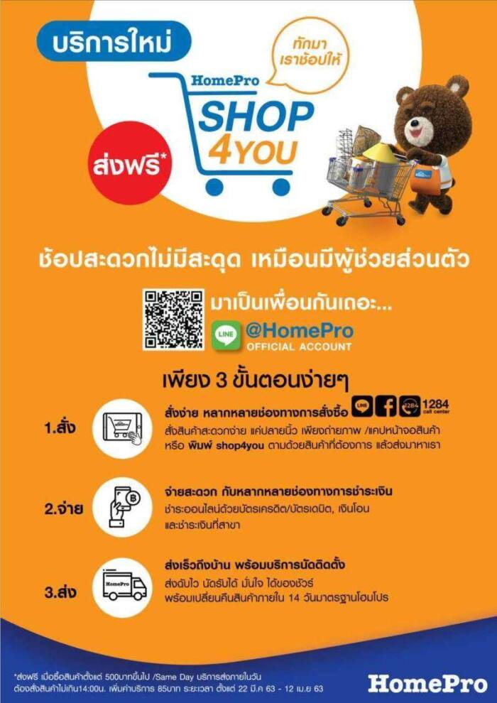 โฮมโปร ห่วงใยด้านสุขภาพลูกค้า จากไวรัส โควิด-19 เปิดเกมรุกเขย่าตลาด ช้อปออนไลน์หลังปิดสาขาชั่วคราว 22 วัน เปิดตัวบริการใหม่ SHOP4YOU เพียงแอดไลน์ เพิ่มเพื่อน @Homepro ทักมาเราช้อปให้ แค่นี้ง่ายๆ ก็มีผู้ช่วยส่วนตัวในการซื้อสินค้าที่โฮมโปร ได้ทุกสาขา หรือสั่งทาง Facebook HomePro Thailand และ Call Center 1284 ง่ายแค่ปลายนิ้ว เพียงแคปหน้าจอ หรือถ่ายรูปสินค้าที่คุณต้องการแล้วส่งมาหาเรา พร้อมส่งฟรีทั่วไทย ตลอด 24 ชั่วโมง เริ่ม 24 มี.ค.นี้