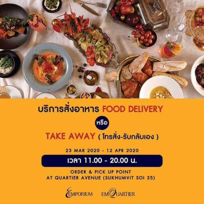 สืบเนื่องจากการปิดศูนย์การค้าชั่วคราวตามประกาศของกรุงเทพมหานคร ศูนย์การค้า ดิ เอ็มโพเรี่ยม และ ดิ เอ็มควอเทียร์ ย้ำภาพลักษณ์ในการเป็นครัวของคนสุขุมวิท ร่วมมือกับร้านอาหารและเครื่องดื่มชั้นนำ ในโซน ฮีลิกซ์ สกาย ไดนิ่ง (Helix Sky Dining) และร้านอาหารภายในศูนย์การค้า ได้แก่ อนาเธอร์ฮาวด์ คาเฟ่ (ANOTHER HOUND CAFÉ), อาโออิ (AOI), เบลล่า ร็อคค่า (BELLA ROCCA), ดาร์ค (D’ARK), ดีน แอนด์ เดลูก้า (DEAN & DELUCA), เอสเคป แบงค็อก (ESCAPE BANGKOK), ฟูจิ เจแปนนิส เรสเตอร์รอง (FUJI JAPANESE RESTAURANT), โฟร์ซีซั่น (FOUR SEASONS), กาก้า แอทติจูท อิน อะ คัพ (GAGA ATTITUDE IN A CUP), ไก่ฮาวด์ (GAIHOUND), เกรย์ฮาวด์ คาเฟ่ (GREY HOUND CAFE), กับข้าวกับปลา (KUBKAO’ KUBPLA), ฮาเก้นดาส (HÄAGEN-DAZS), โคอิเตะ (KOI THE), แหลมเจริญซีฟู้ด (LAEM CHAROEN SEAFOOD), เลอ ดาลัต (LE DALAT), หม่าน ฟู่ หยวน คิทเช่น (MAN FU YUAN KITCHEN), เอ็มเค ไลฟ์ (MK LIVE), นารา ไทย คูซีน (NARA THAI CUISINE), พอล (PAUL), ทองสมิทธิ์ (THONG SMITH), เทนยู โช (TENYUU SHO), ยูแอนด์ไอ พรีเมี่ยม สุกี้ บุฟเฟ่ต์ (YOU & I PREMIUM SUKI BUFFET), คาเฟ่ ไลท์ซ บาย พาคามาร่า (CAFE LEITZ BY PACAMARA), แฮร์รอดส์ (HARRODS), มอซซ่า บาย โคคอต (MOZZA BY COCOTTE) และ วิกตอเรียส์ บาย โคคอต (VICTORIA BY COCOTTE) จัดบริการพิเศษสั่งอาหารทางโทรศัพท์ และบริการส่งอาหารถึงบ้านอย่างรวดเร็ว รวมถึงจัดบริการจุดสั่งอาหาร และรับอาหาร ทางเข้าอาคาร C หน้ากูร์เม่ต์ มาร์เก็ต ชั้น G ศูนย์การค้า ดิ เอ็มควอเทียร์ อำนวยความสะดวกให้ลูกค้าที่ต้องการเดินทางมาสั่งอาหารเอง โดยร้านอาหารต่างๆ จะมาตั้งเคาน์เตอร์ บริการเมนูอาหาร สั่งอาหาร และรับอาหาร เฉพาะจุดดังกล่าวเท่านั้น ตั้งแต่เวลา 11.00 – 20.00 น. ทุกวัน
