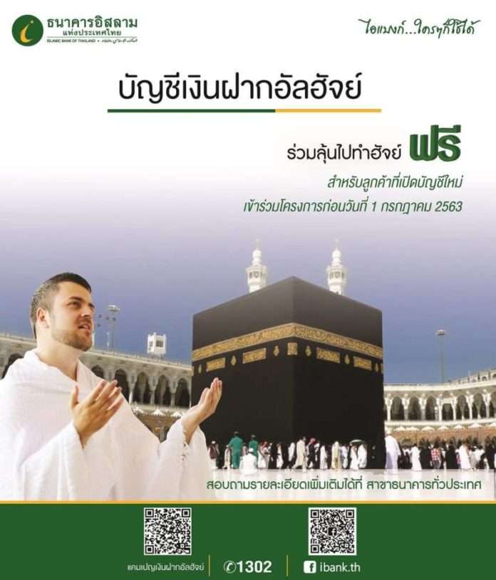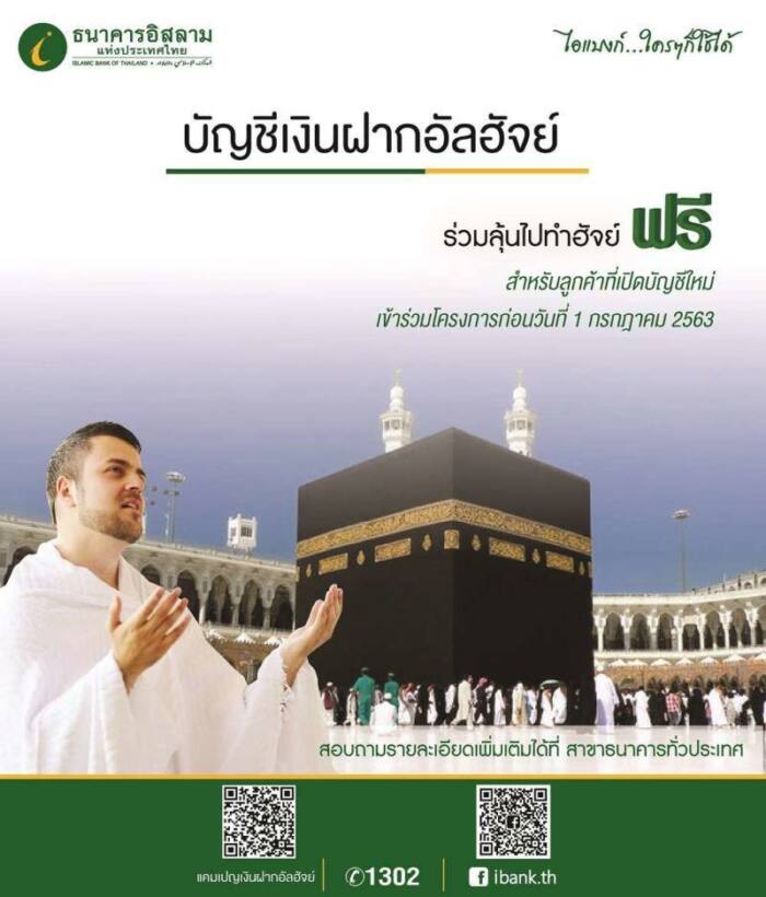 ธนาคารอิสลามแห่งประเทศไทย (ไอแบงก์) ส่งเสริมการปฏิบัติศาสนากิจอันดีงามของพี่น้องมุสลิม ด้วยการมอบสิทธิพิเศษสำหรับลูกค้าเงินฝากบัญชีอัลฮัจย์ ลุ้นรับแพคเกจไปประกอบพิธีฮัจย์ฟรี! จำนวน 8 รางวัล รวมมูลค่า 1,600,000 บาท