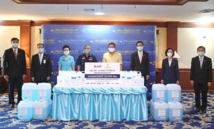 เมื่อเร็วๆ นี้ – พลอากาศเอก มานัต วงษ์วาทย์ ผู้บัญชาการทหารอากาศ (กลางซ้าย) รับมอบแอลกอฮอล์ จากบริษัท ปตท. จำกัด (มหาชน) โดย นายชาญศิลป์ ตรีนุชกร ประธานเจ้าหน้าที่บริหารและกรรมการผู้จัดการใหญ่ (กลางขวา) พร้อมด้วยคณะผู้บริหาร ร่วมส่งมอบ แอลกอฮอล์ความเข้มข้น 95 เปอร์เซ็นต์ ที่ได้จัดหาจากโรงงานผลิตแอลกอฮอล์ในประเทศ และแอลกอฮอล์ 70 เปอร์เซ็นต์ เจลแอลกอฮอล์ และสเปรย์ฆ่าเชื้อ ที่ได้จัดหาเพิ่มเติมเพื่อนำไปกระจายให้แก่หน่วยงานรัฐ และโรงพยาบาลในแต่ละพื้นที่ สำหรับแอลกอฮอล์ที่กองทัพอากาศได้รับมอบในครั้งนี้ จะนำไปมอบให้กับกรมแพทย์ทหารอากาศ เพื่อแจกจ่ายไปยังโรงพยาบาลต่างๆ ในสังกัดของกองทัพอากาศ อาทิ โรงพยาบาลภูมิพลอดุลยเดช โรงพยาบาลทหารอากาศ (สีกัน) โรงพยาบาลจันทรุเบกษา และโรงพยาบาลภายในกองบินต่างๆ ทั่วประเทศ
