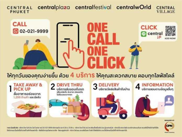 6 เมษายน 2563 บริษัท เซ็นทรัลพัฒนา จำกัด (มหาชน) หรือ CPN ยกระดับการให้บริการเพื่อดูแลลูกค้าและคู่ค้าอย่างเต็มที่ เปิดตัวบริการใหม่เพื่ออำนวยความสะดวกสบายในการช้อปปิ้งและสั่งอาหารที่จะเปลี่ยนวันที่ยุ่งยากให้เป็นเรื่องง่าย ด้วยบริการ ONE CALL x ONE CLICK แค่คุณขอมา เราก็จัดให้! ครบ-จบ โทรเบอร์เดียว โทร 02-021-9999 คลิกครั้งเดียว ด้วยการ add LINE CentralLife สะดวก ปลอดภัย ช้อปชิมได้ตามใจคุณ รวบรวมร้านค้าร้านอาหาร กว่า 1,200 ร้าน ทั่วประเทศ ด้วยบริการให้ข้อมูลลูกค้าต่างๆ แบบ One Stop Shopping Assistant ทั้งข้อมูลเวลา เปิด-ปิดศูนย์ฯ, รายชื่อร้านค้าที่ยังเปิดอยู่ ณ ขณะนี้, เบอร์โทรฯ ของร้านค้าต่างๆ ที่สามารถสั่ง Delivery หรือ Take Away ได้ รวมถึงสั่งอาหารของแต่ละสาขา และจุดบริการ Drive thru ทุกสาขาทั่วประเทศ โดยเริ่มให้บริการแล้วตั้งแต่วันนี้ พร้อมต่อยอดบริการ Drive Thru ทั่วประเทศทั้ง เซ็นทรัลเวิลด์, เซ็นทรัลพลาซา, เซ็นทรัลเฟสติวัล, เซ็นทรัล ภูเก็ต และ เซ็นทรัล วิลเลจ
