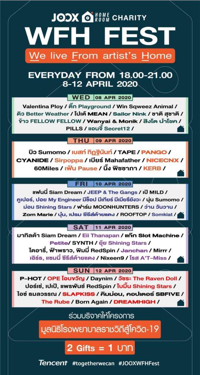 JOOX แอปมิวสิคคอมมูนิตี้อันดับ 1 ของเมืองไทย ส่งตรงความสุขถึงบ้านกับออนไลน์เฟสติวัล HOMEROOM CHARITY : W F H Fest. (We LIVE From artist’s Home) เทศกาลดนตรีที่ศิลปินและคุณจะสนุกไปพร้อมๆ กันจากที่บ้าน! กับกองทัพศิลปินกว่า 50 คน ที่จะมาไลฟ์กันสดๆ ส่งตรงความสุขถึงบ้านคุณ ในระหว่างวันที่ 8-12 เมษายนนี้กับ 5 วันเต็มๆ ที่คุณจะได้รับชมความสนุก อิ่มเอมแบบเน้นๆได้ที่ JOOX เท่านั้นตั้งแต่ 18.00 -21.00 น.