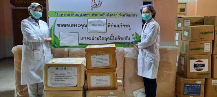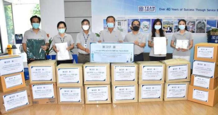 ทีมกรุ๊ป ร่วมกับมูลนิธิกลุ่มทีมรวมใจ นำโดย ดร.ประเสริฐ ภัทรมัย (ที่4จากซ้าย) ผู้ก่อตั้งและกรรมการอาวุโส ประธานกรรมการมูลนิธิกลุ่มทีมรวมใจ  ดร.อภิชาติ สระมูล (ที่3จากขวา) ประธานเจ้าหน้าที่บริหาร ทีมกรุ๊ป พร้อมทีมผู้บริหาร บริษัท ทีม คอนซัลติ้ง เอนจิเนียริ่ง แอนด์ แมเนจเมนท์ จำกัด (มหาชน) หรือ TEAMG มอบชุด PPE จำนวน 400 ชุด หน้ากาก N95 จำนวน 1,100 ชิ้น หน้ากากอนามัย Surgical masks จำนวน 600 ชิ้น และ Face shield จำนวน 250 ชุด ให้กับ สถาบันบำราศนราดูร โรงพยาบาลสวรรค์ประชารักษ์ จ.นครสวรรค์ และโรงพยาบาลบันนังสตา จ.ยะลา เพื่อสนับสนุนการทำงานของบุคลากรทางการแพทย์ ในการป้องกันและลดการแพร่ระบาดของโรคติดเชื้อไวรัส COVID-19 ภายใต้โครงการ “ทีมกรุ๊ปร่วมใจต้านวิกฤตไวรัส COVID- 19 ”เพื่อใช้ป้องกันและลดการแพร่ระบาดของโรคติดเชื้อไวรัส COVID- 19