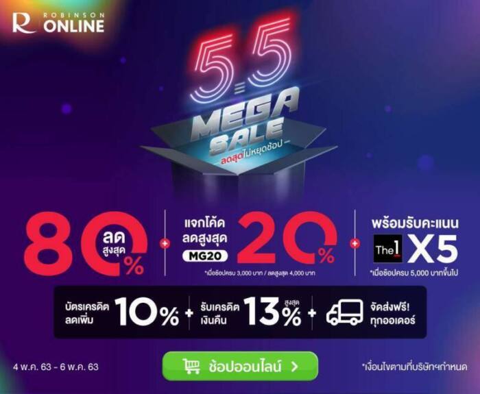 สายช้อปออนไลน์ไม่ควรพลาด! กับแคมเปญ ‘5.5 MEGA SALE ลดสุดไม่หยุดช้อป’ ระหว่างวันที่ 4 – 6 พฤษภาคม 2563 ที่ ROBINSON ONLINE คลิก https://www.robinson.co.th/th