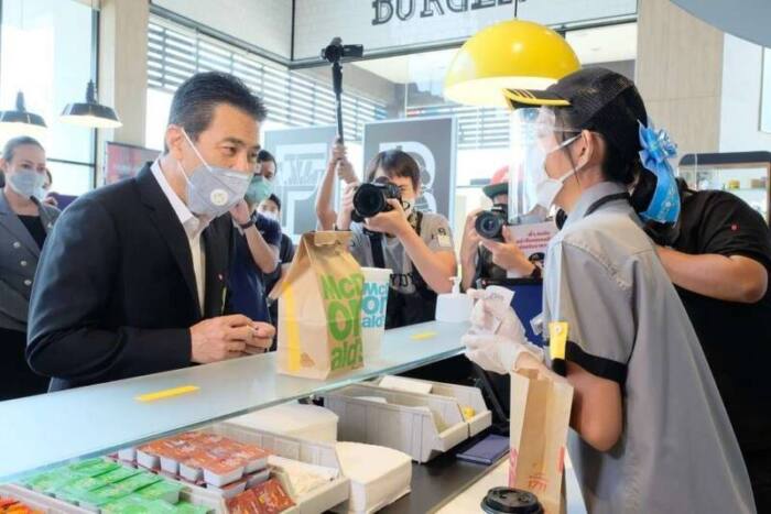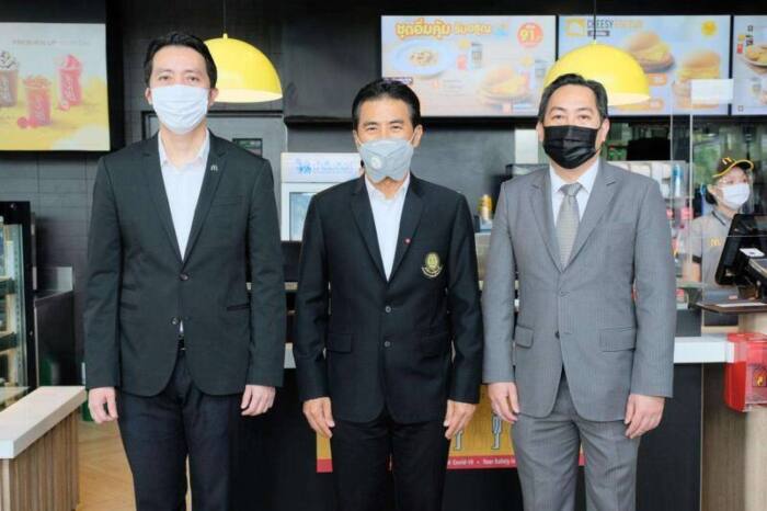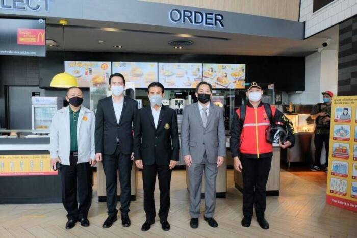 นายธันยเชษฐ์ เอกเวชวิท กรรมการผู้จัดการ และนายปราโมทย์ งามเกริกโชติ ผู้อำนวยการฝ่ายปฏิบัติการ บริษัท แมคไทย จำกัด ให้การต้อนรับ นายเทวัญ ลิปตพัลลภ รัฐมนตรีประจำสำนักนายกรัฐมนตรี กำกับดูแลสำนักงานคณะกรรมการคุ้มครองผู้บริโภค (สคบ.) นำทีมงานลงพื้นที่ตรวจเยี่ยมมาตรการป้องกันการแพร่ระบาดของเชื้อไวรัส Covid-19 ภายในร้านแมคโดนัลด์ และการให้บริการจัดส่งอาหารอย่างปลอดภัยผ่านบริการแมคดิลิเวอรีตามปฏิญญาความร่วมมือในการกําหนดมาตรการความปลอดภัยในการให้บริการจัดส่งอาหารและพัสดุ เพื่อสร้างความมั่นใจให้กับผู้บริโภคในช่วงวิกฤตการแพร่ระบาดไวรัส Covid-19